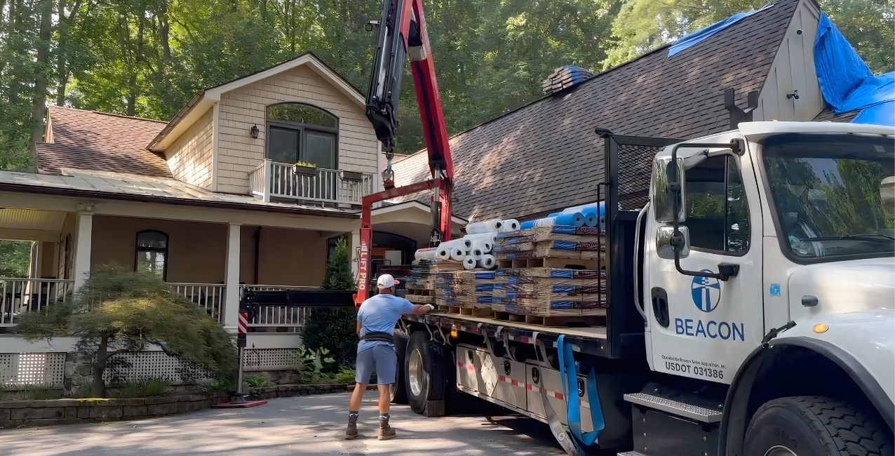 The delivery is handled by a separate truck that’s designed to safely load materials directly onto your roof using a mechanical lift. It’s a quick process, but it requires enough space and easy access to your driveway or curb.